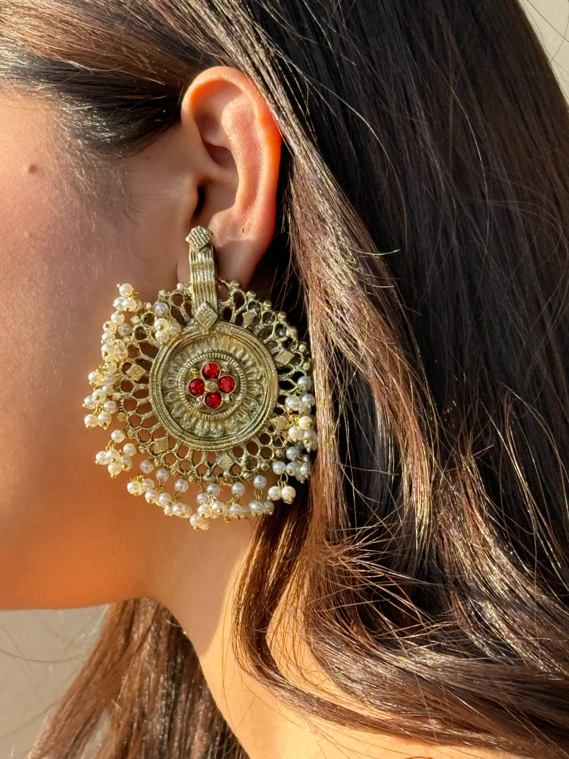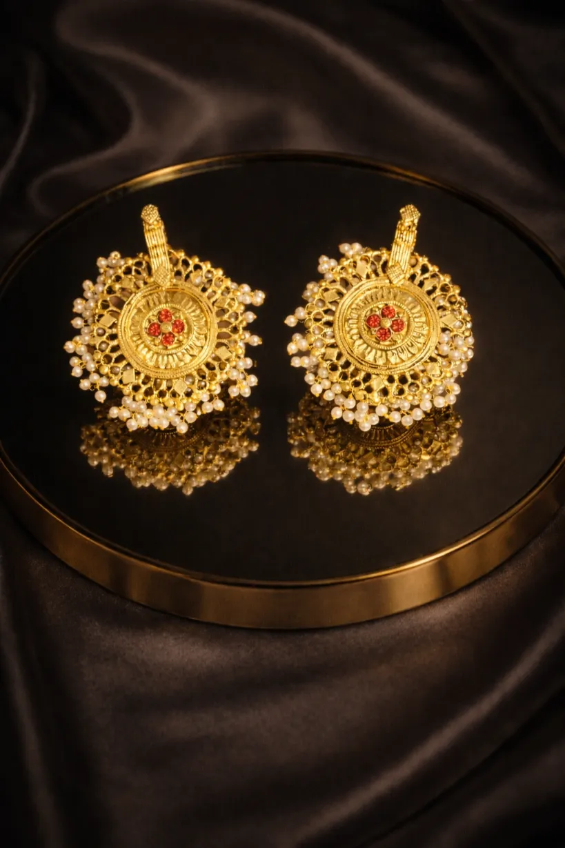 These are elegant flower-shaped earrings featuring traditional South Indian craftsmanship. The center is highlighted with deep red Kemp stones, surrounded by intricate gold metalwork. A delicate fringe of tiny white pearls circles the edges, giving them a classic Temple Jewellery look. These studs are perfect for adding a royal touch to Sarees or Lehengas during weddings and festive occasions.