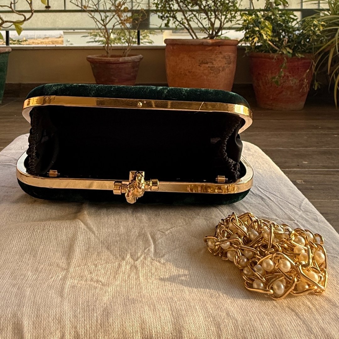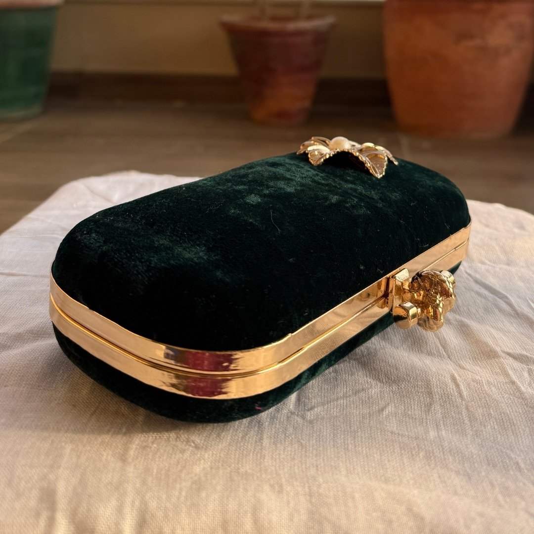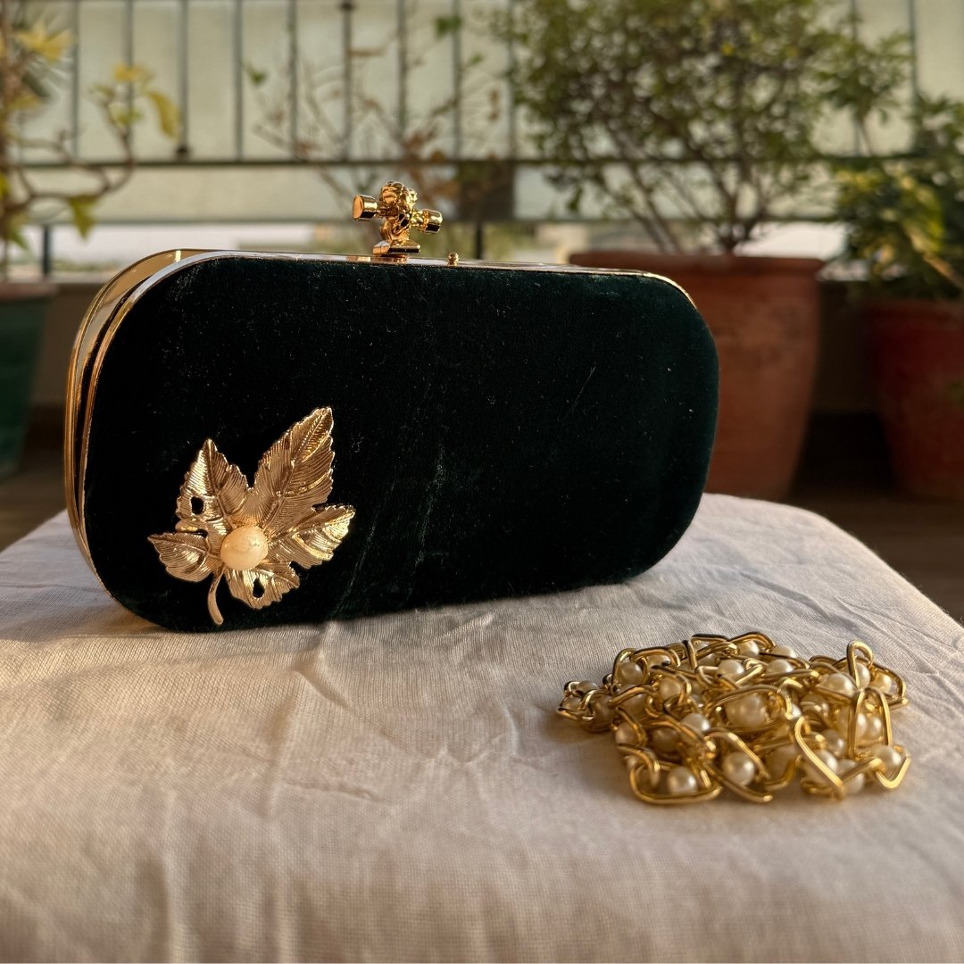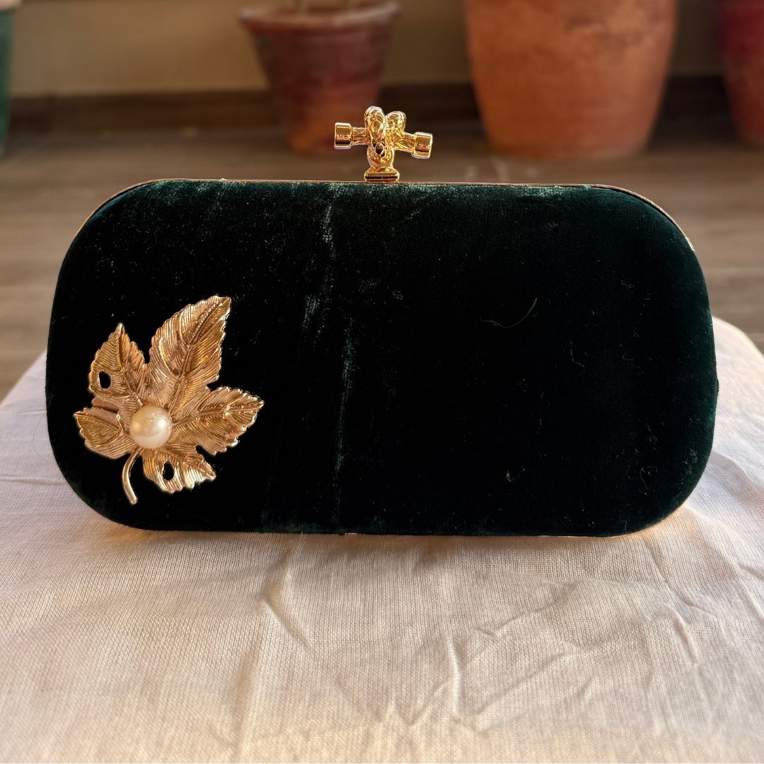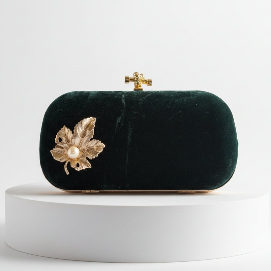 Complete your elegant look with this luxurious bottle green velvet clutch, designed to add grace to your special moments. Its rich velvet texture gives a soft, premium feel, beautifully detailed with a metal leaf stud placed on the velvet body of the clutch, adding a refined, nature-inspired touch.