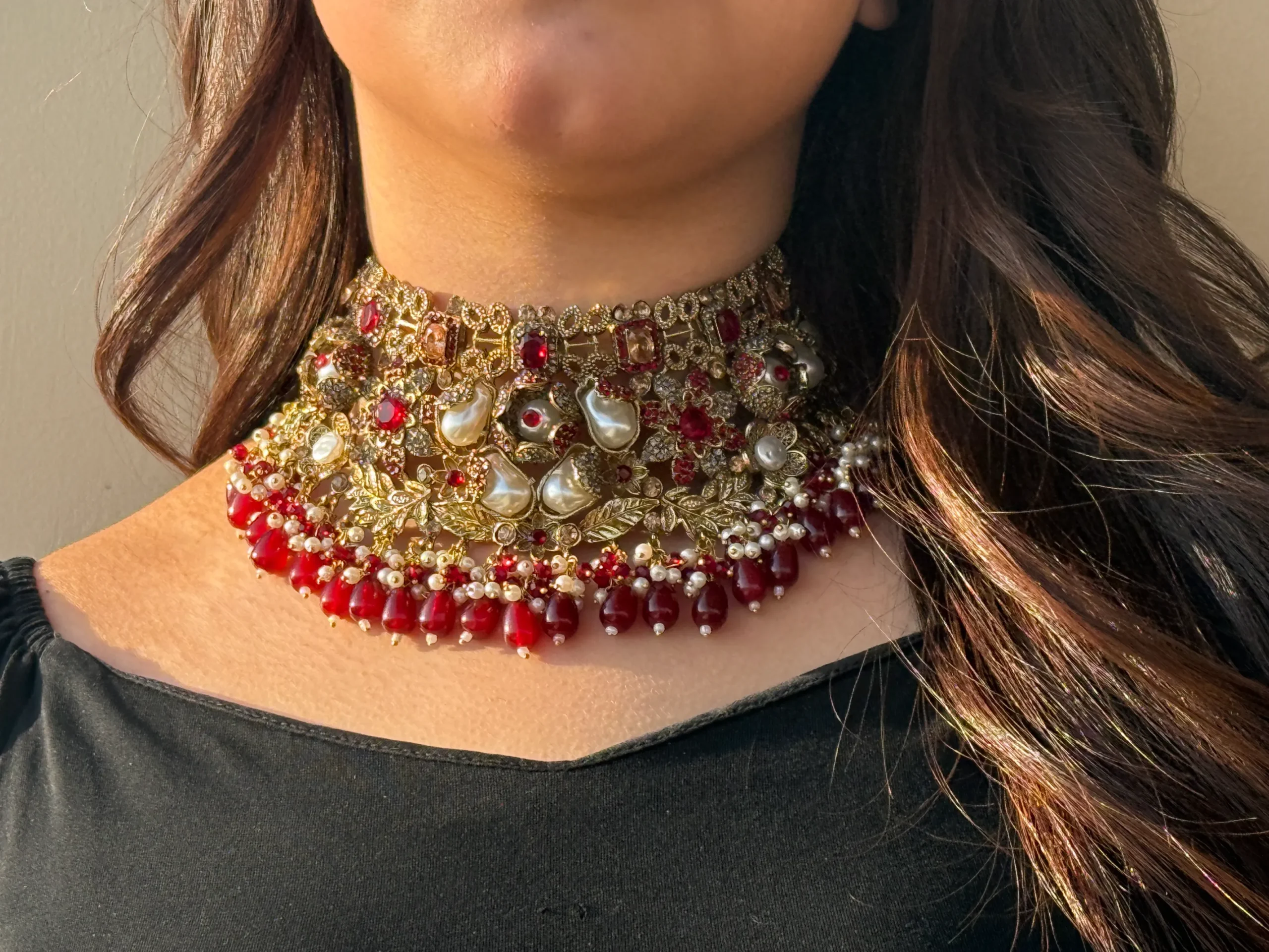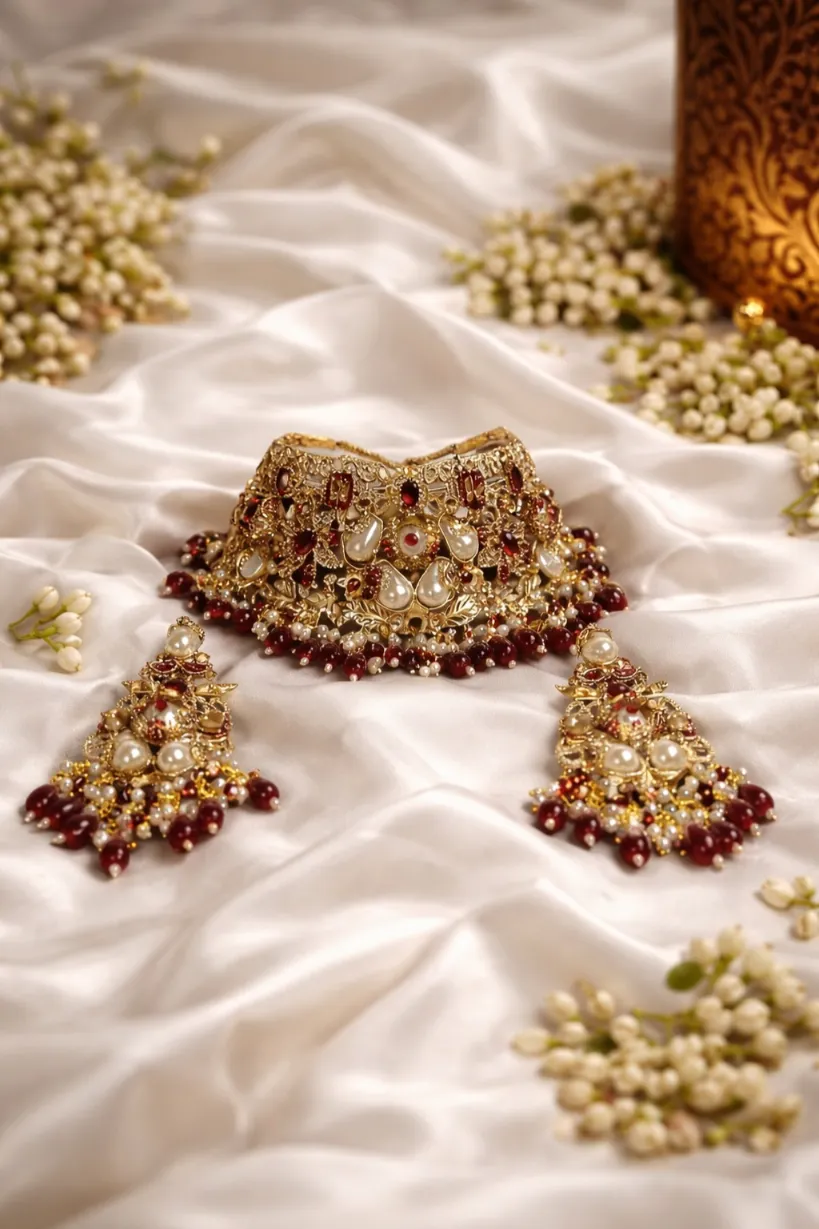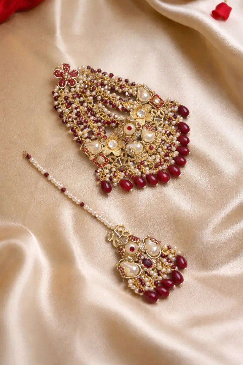 This beautiful jewelry set features a stunning gold-tone finish with elegant pearls and deep red stones. It comes with a matching choker, earrings, maang tikka, and jhumar, making it a complete set for weddings and special celebrations. A timeless collection that gives you a royal and graceful look.