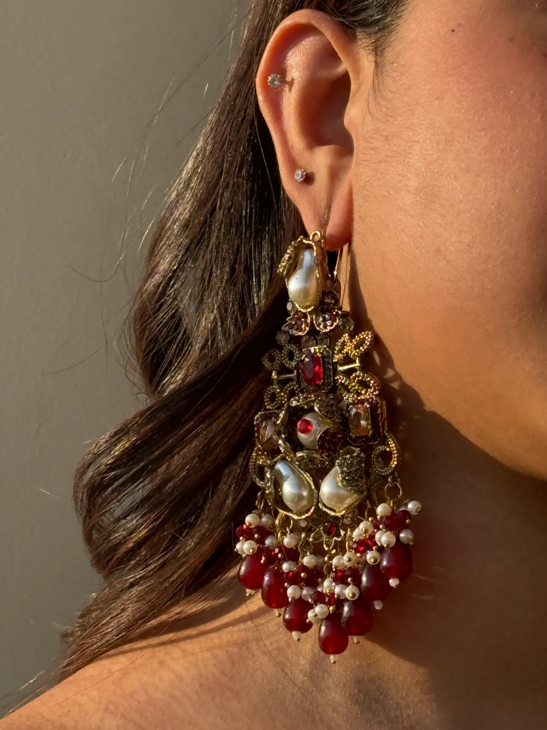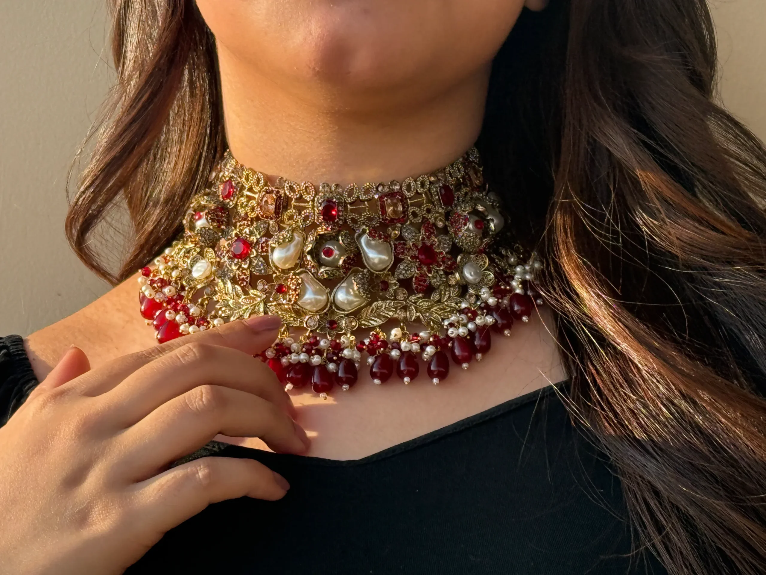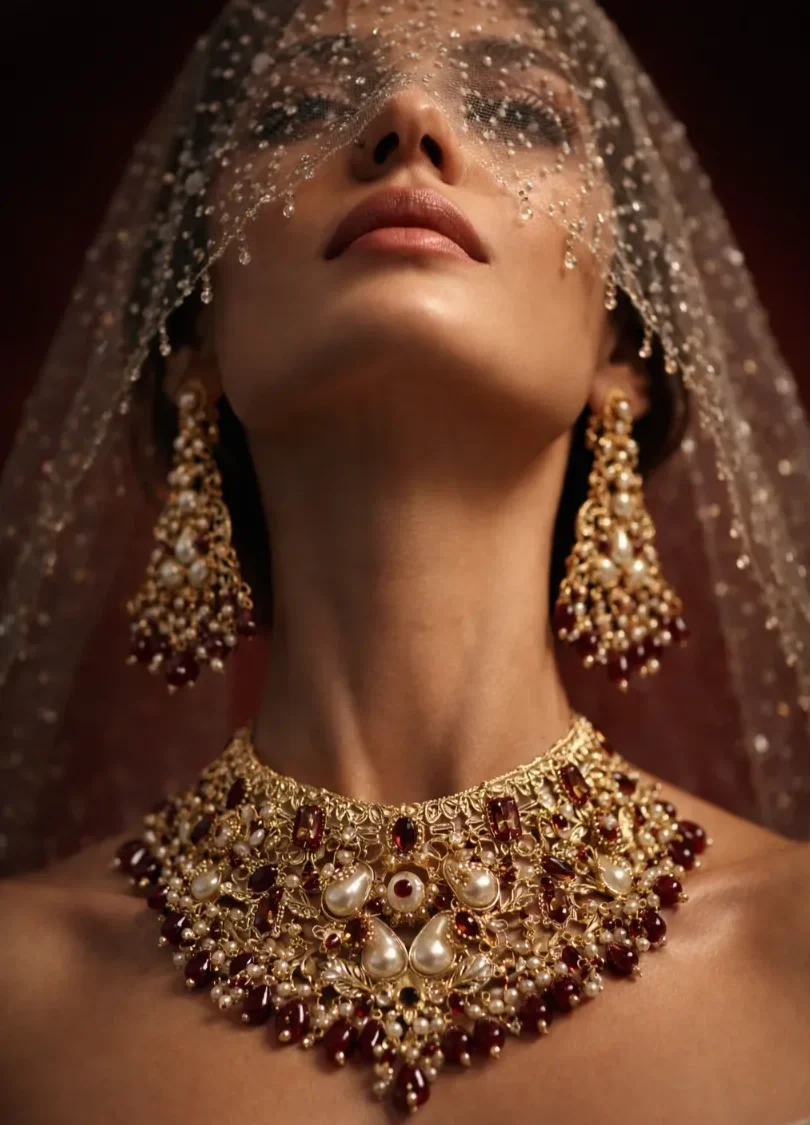 This beautiful jewelry set features a stunning gold-tone finish with elegant pearls and deep red stones. It comes with a matching choker, earrings, maang tikka, and jhumar, making it a complete set for weddings and special celebrations. A timeless collection that gives you a royal and graceful look.