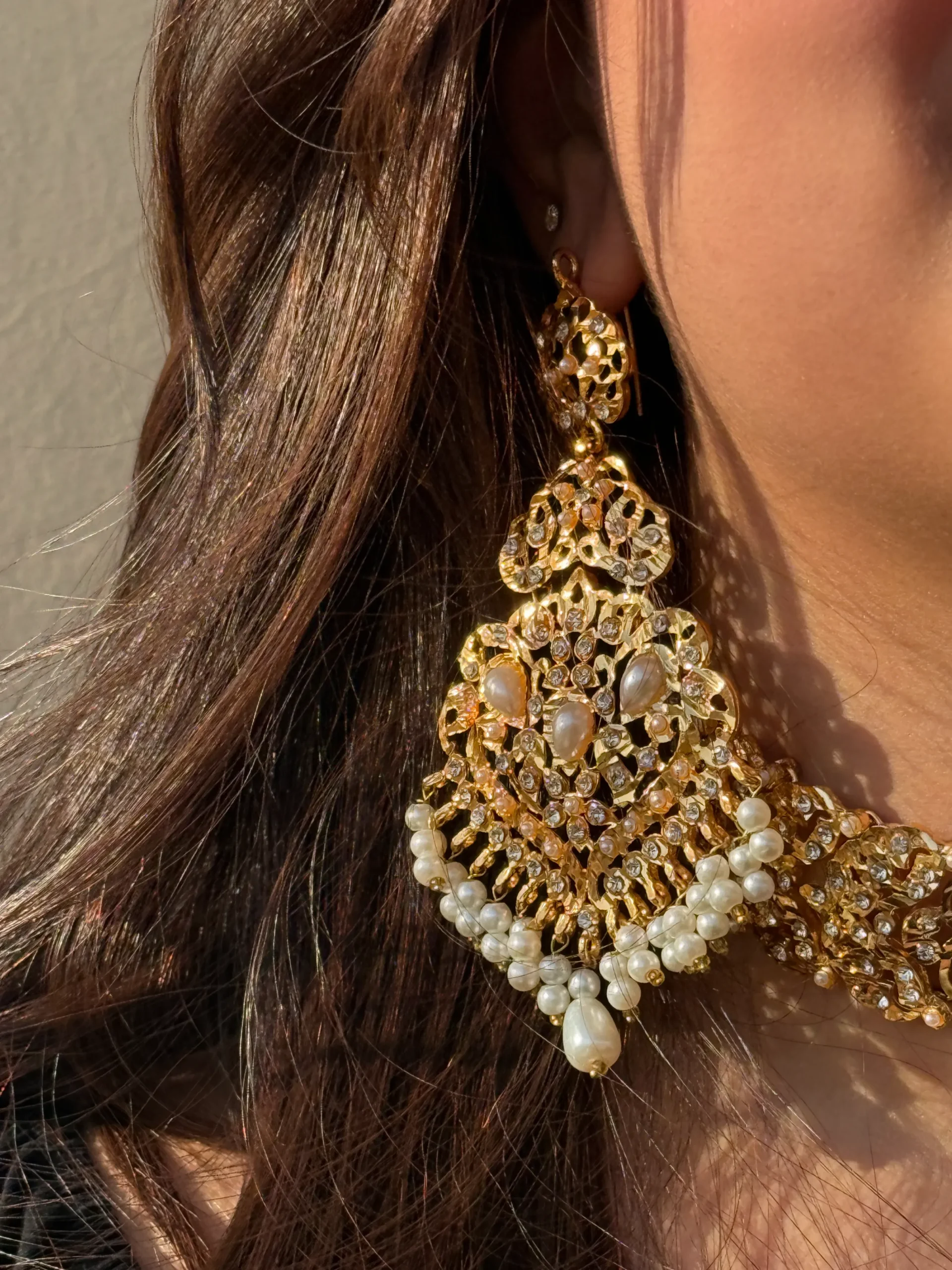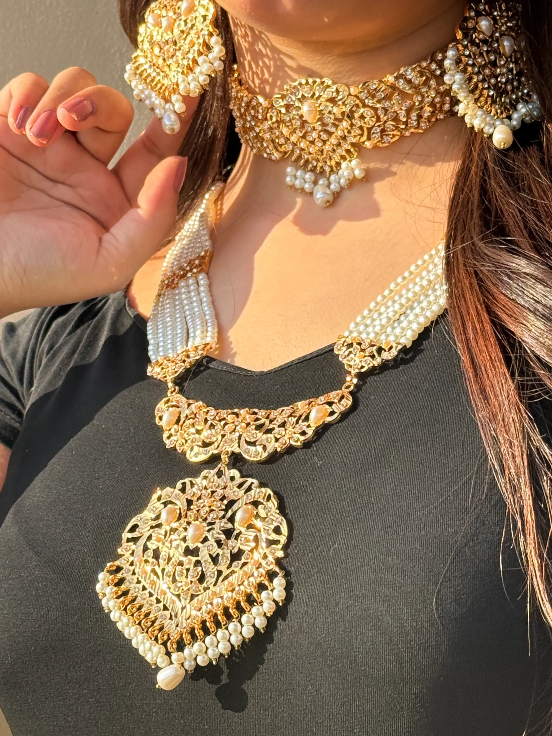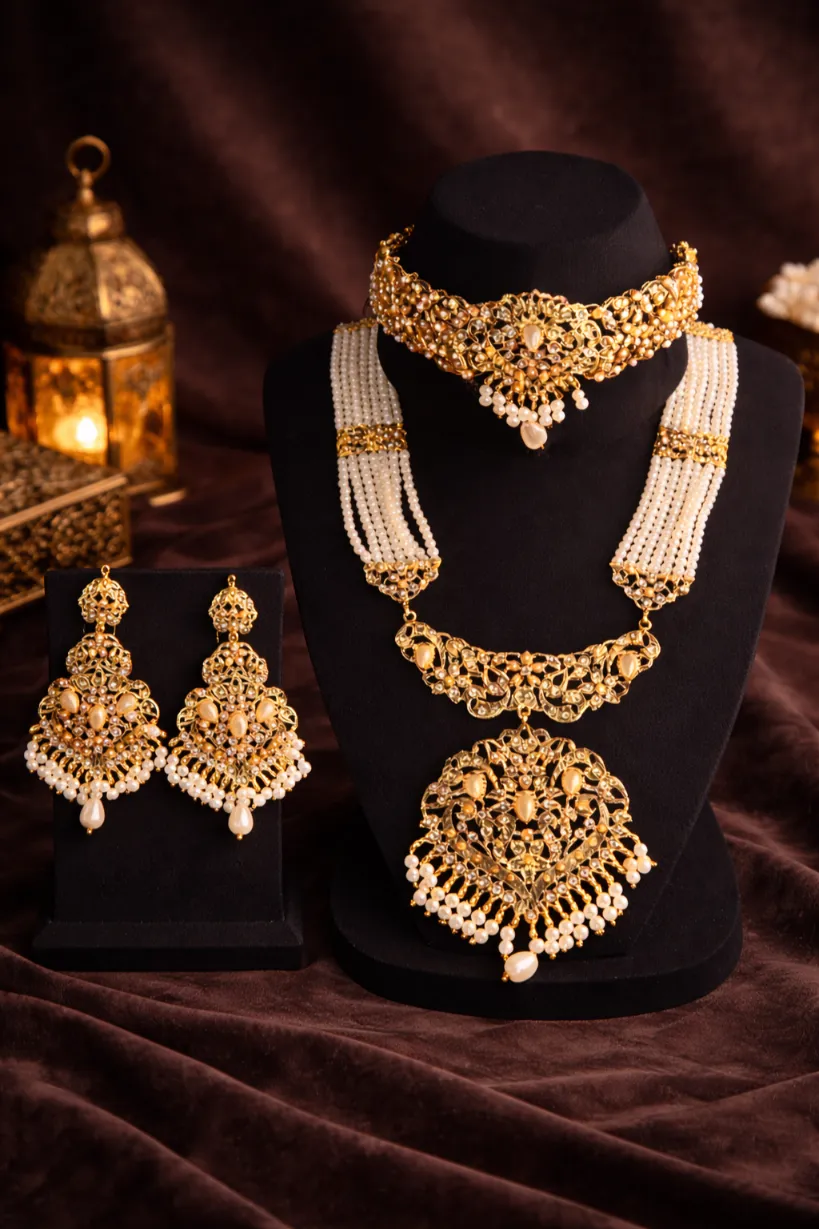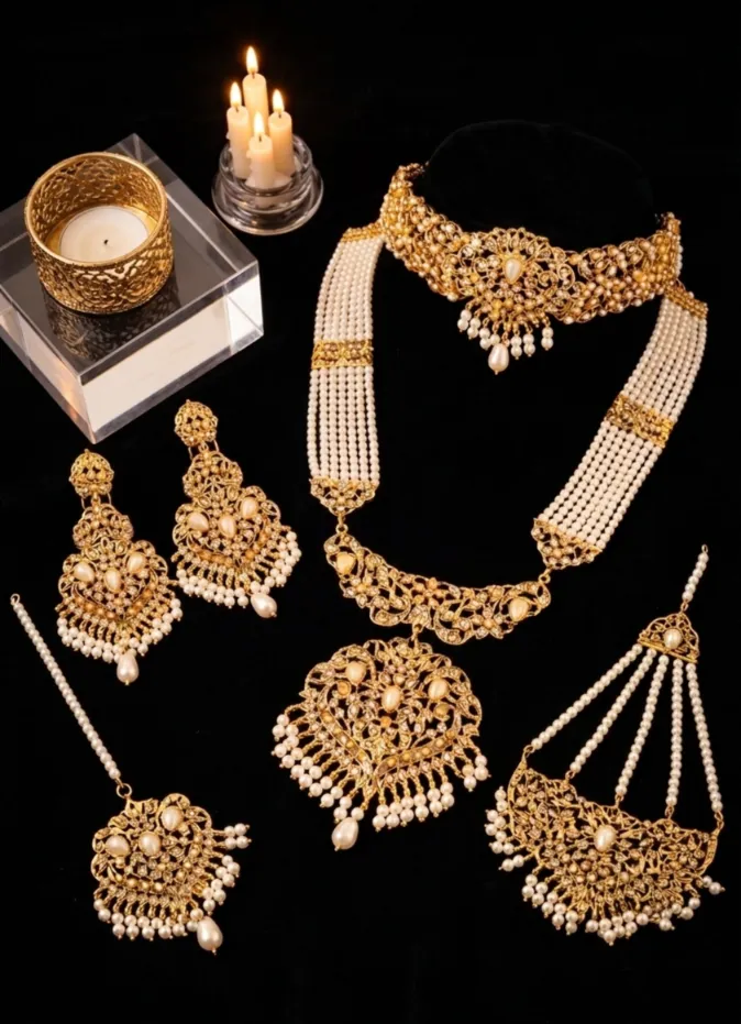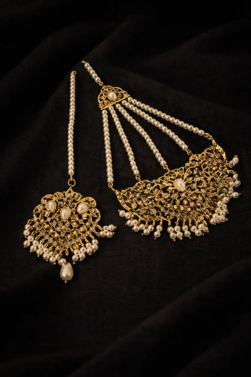 Whether it’s your big day or a festive celebration, this regal set is designed to make you feel like a queen. Complete your bridal look with the matching Maang Tikka and Jhumar (Passa). Both pieces are finely crafted in gold tones with delicate pearls, adding a royal and graceful touch to your ensemble.