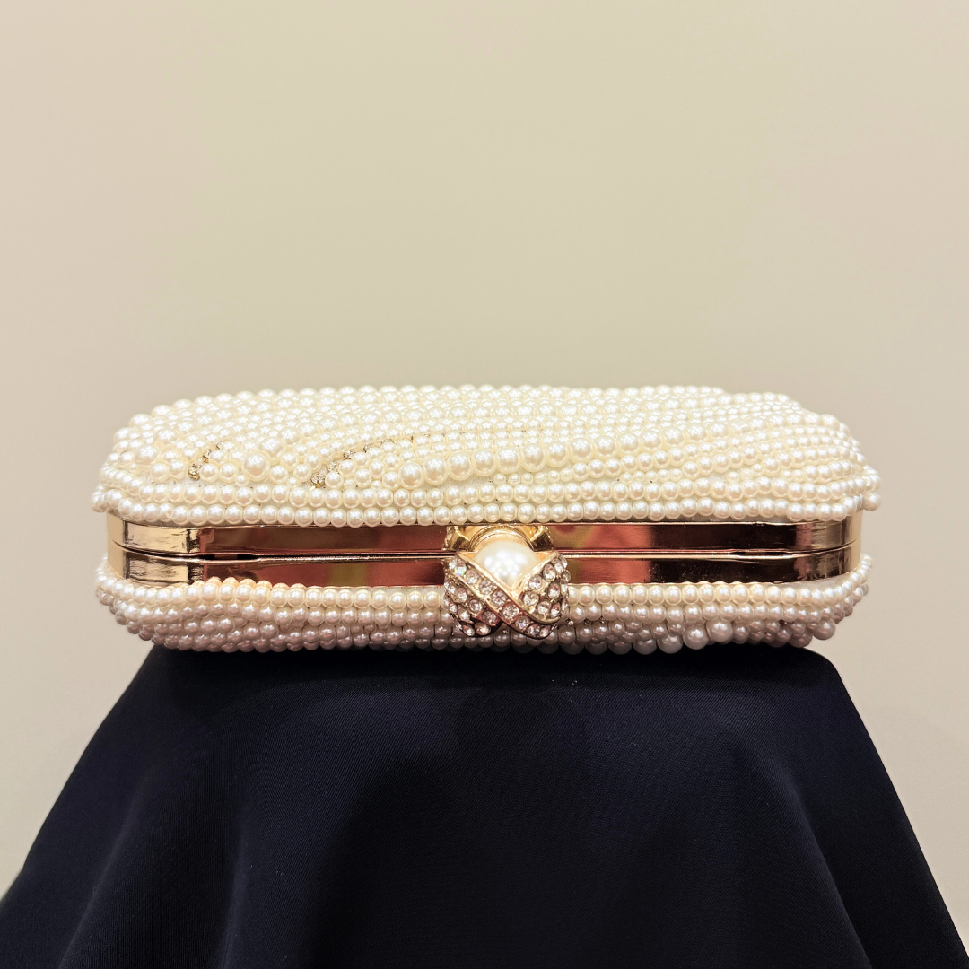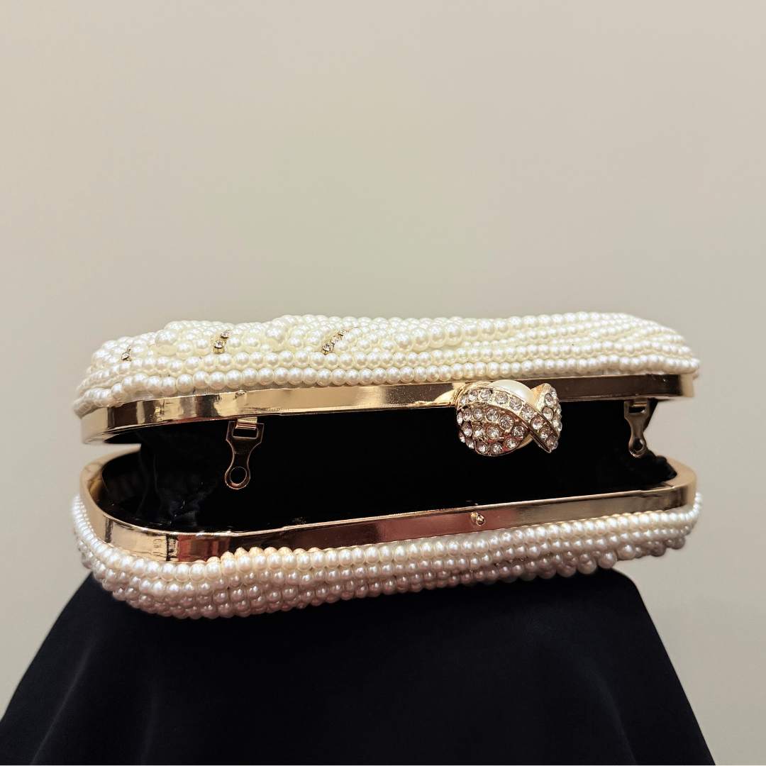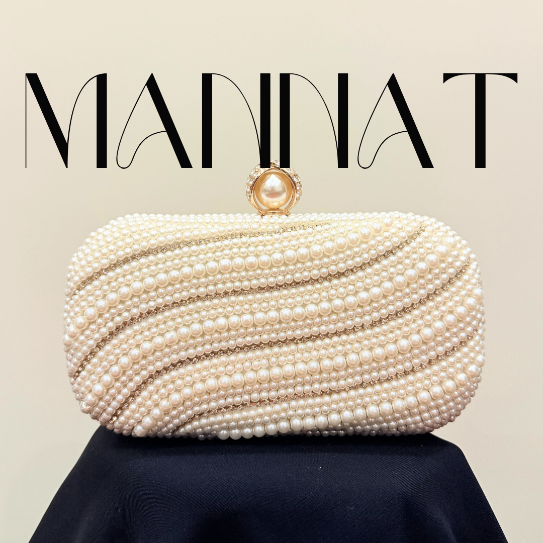 The MANNAT clutch in elegant ivory is the epitome of classic glamour. This stunning piece is meticulously adorned with a cascading design of pearls in varying sizes, creating a rich, textured, and luxurious look. The shimmering pearls are interspersed with delicate lines of sparkling rhinestones, adding an extra layer of brilliance. It features a sophisticated gold-toned clasp, beautifully topped with a central pearl and halo of crystals.