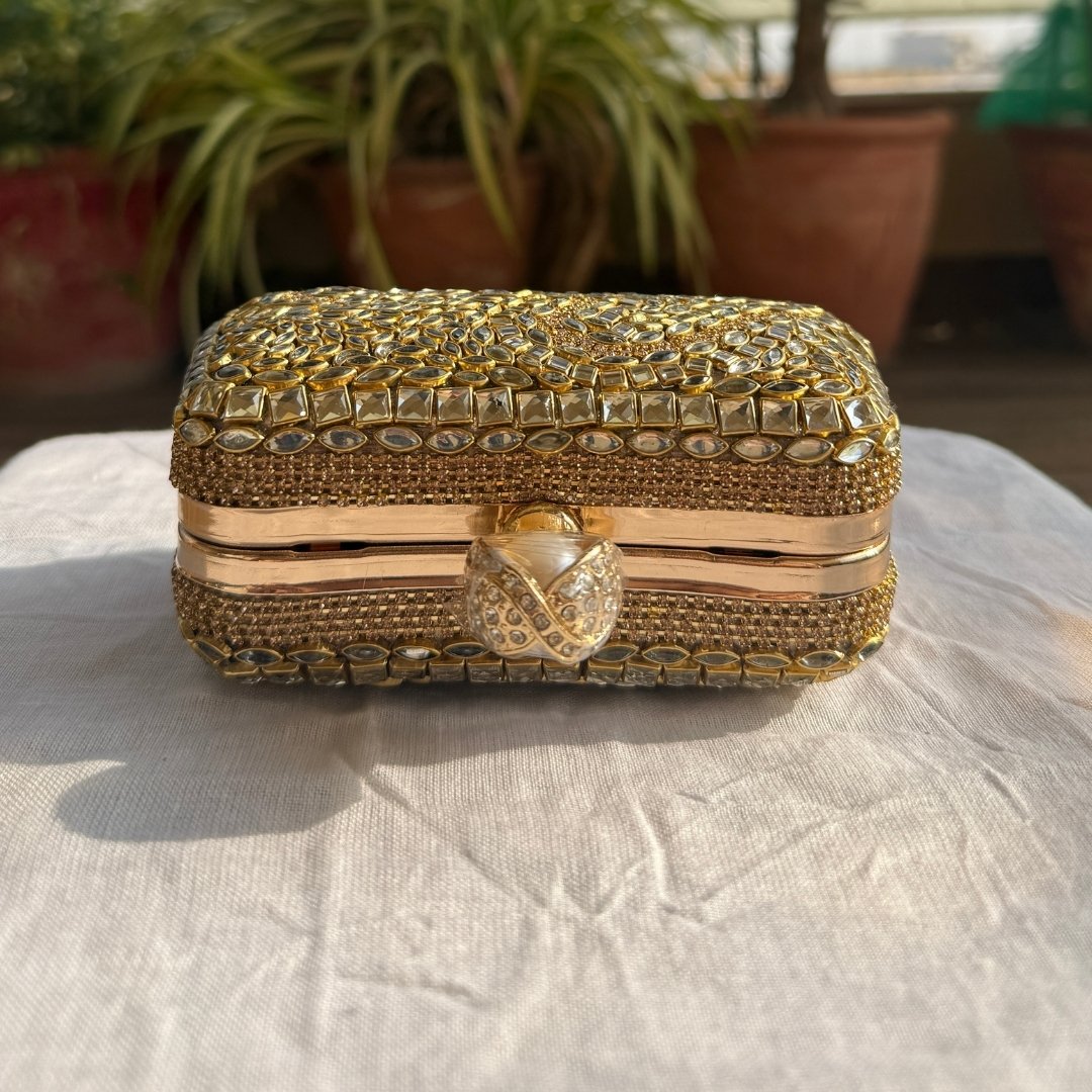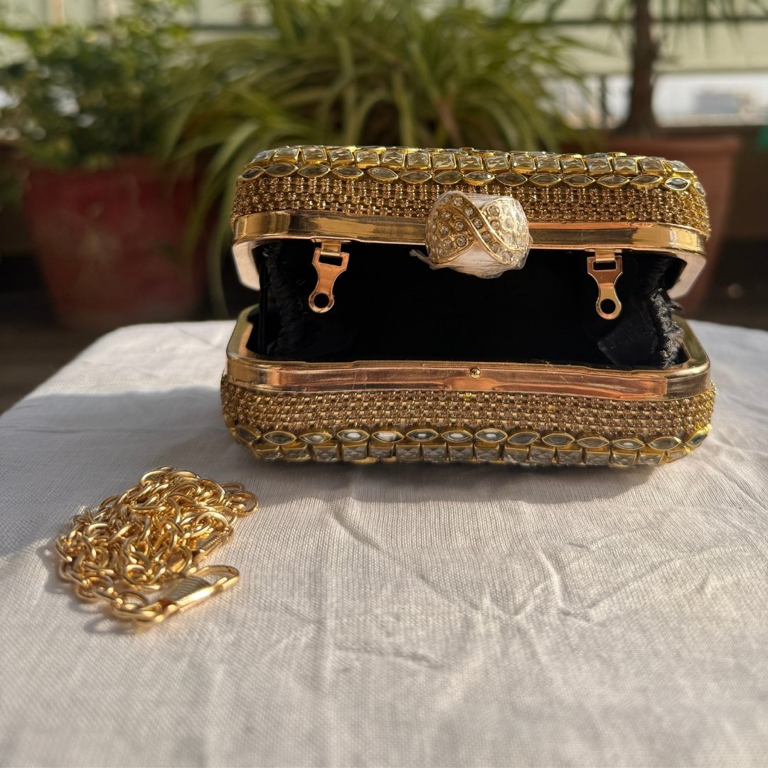 This beautiful mini clutch is inspired by our rich heritage. It is carefully decorated by hand with detailed Kundan work that shines beautifully in the light.