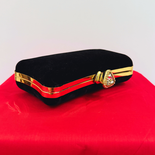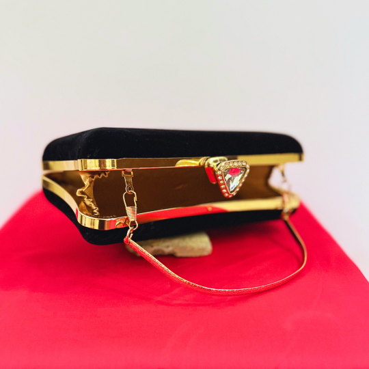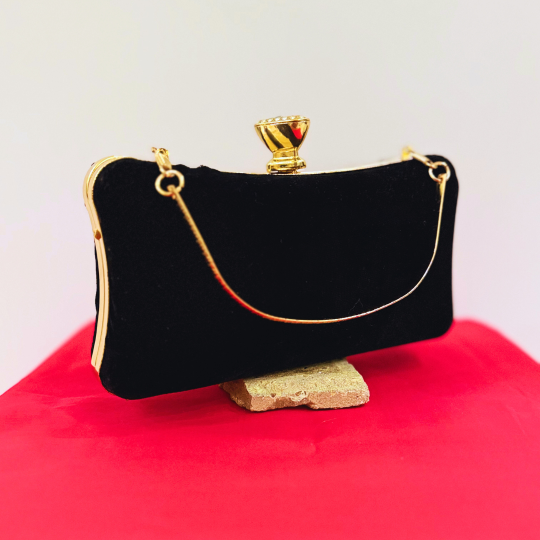 Complete your elegant look with Noir, a black velvet clutch topped with a striking triangular gem.