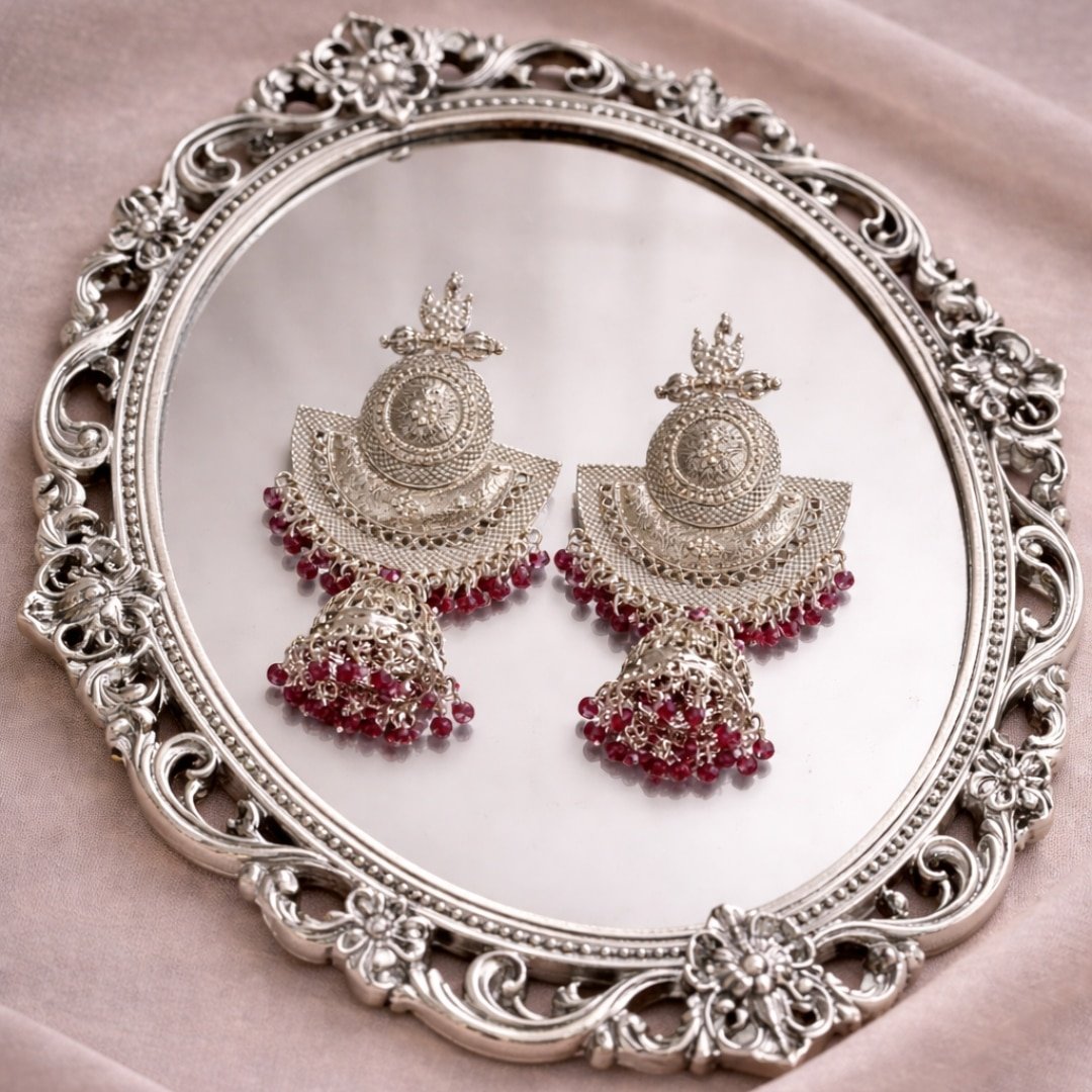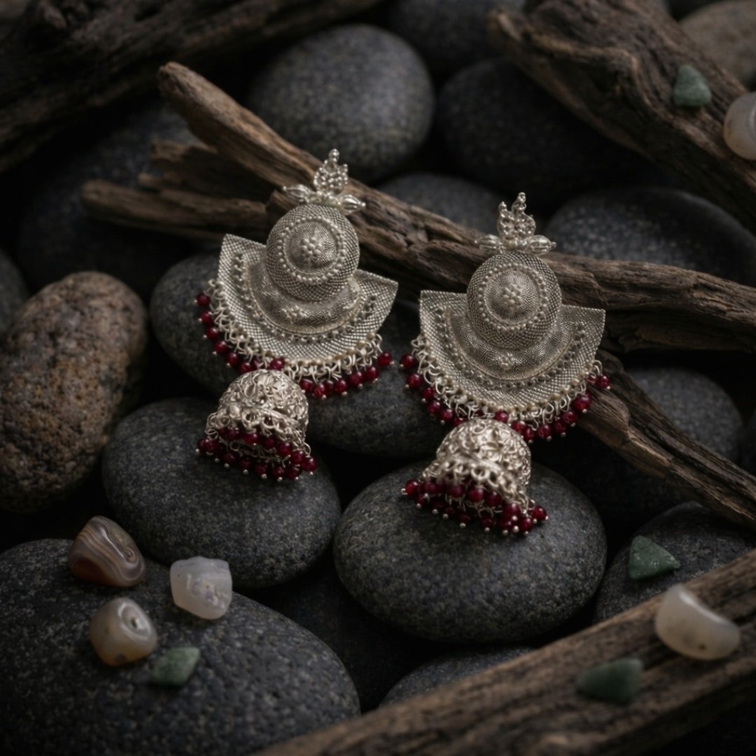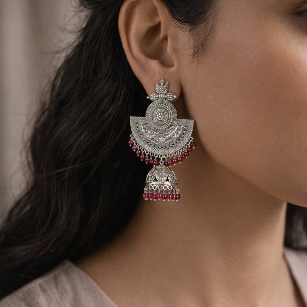 Elevate your ethnic style with these stunning Oxidized Silver Jhumkas, featuring intricate floral engravings and vibrant Ruby-Red beaded dropes. Lightweight and elegant, they are the perfect statement piece for weddings, festivals, or any special occasion. A timeless blend of tradition and modern charm.