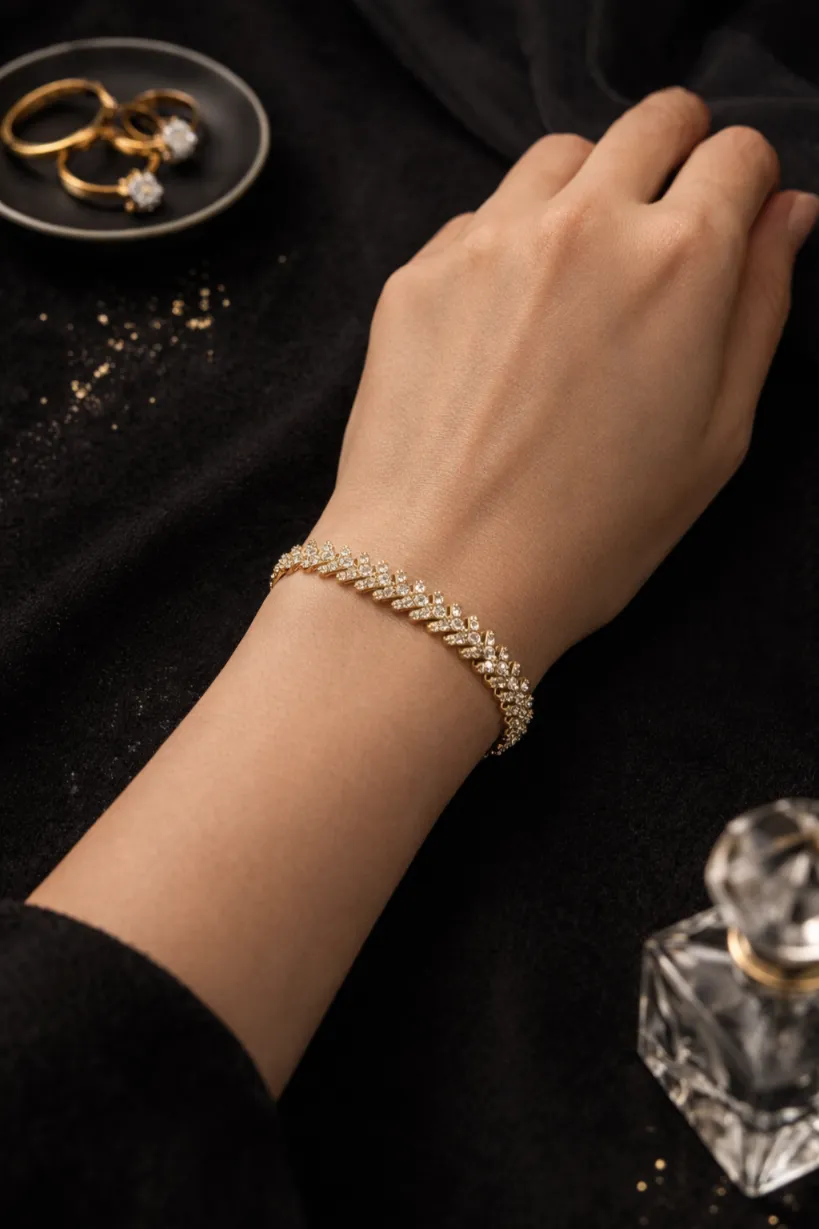 Add a touch of elegance to your wrist with our Petal Bracelet. Featuring a beautiful, leaf-inspired design, this bracelet sparkles perfectly with every move. It is a versatile design that looks just as stunning with western wear as it does with traditional outfits, making it the perfect accessory for any look.