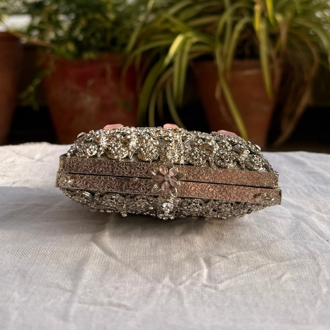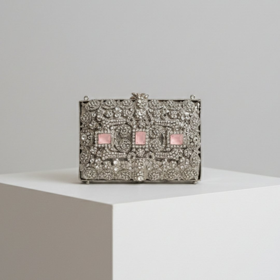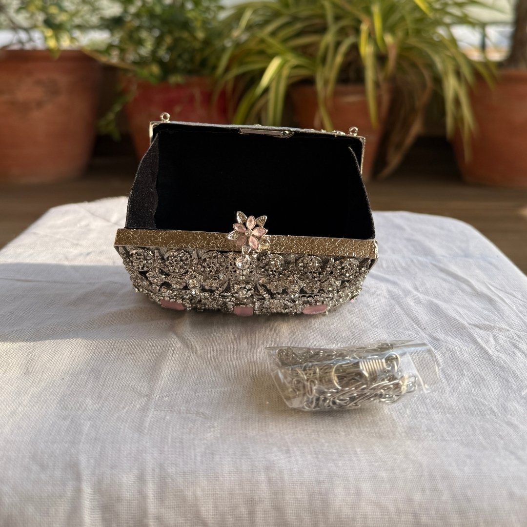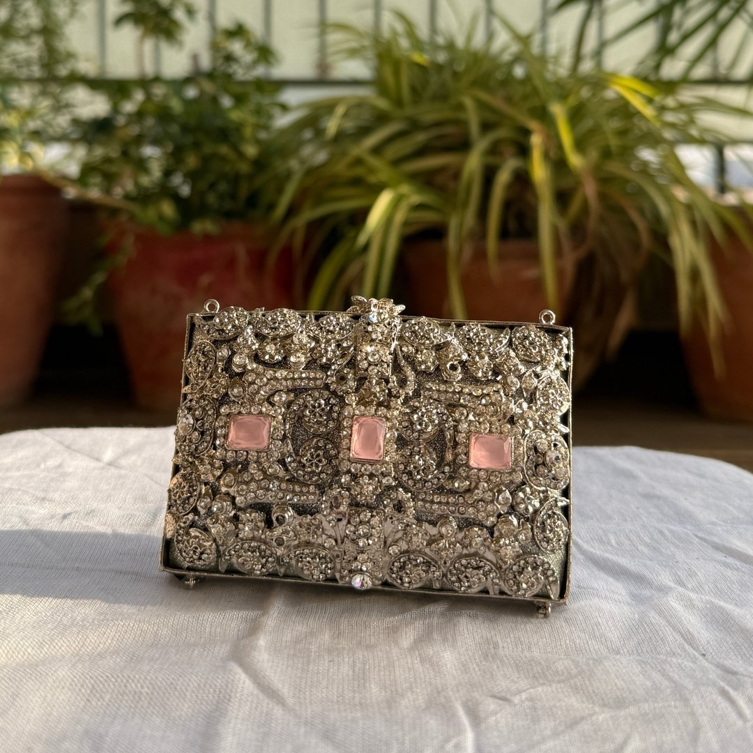 Compact, classy, and adorned with exquisite stones, this mini metal clutch is your ultimate accessory for festive nights. Effortlessly add sophistication to your party, Eid, or wedding look.