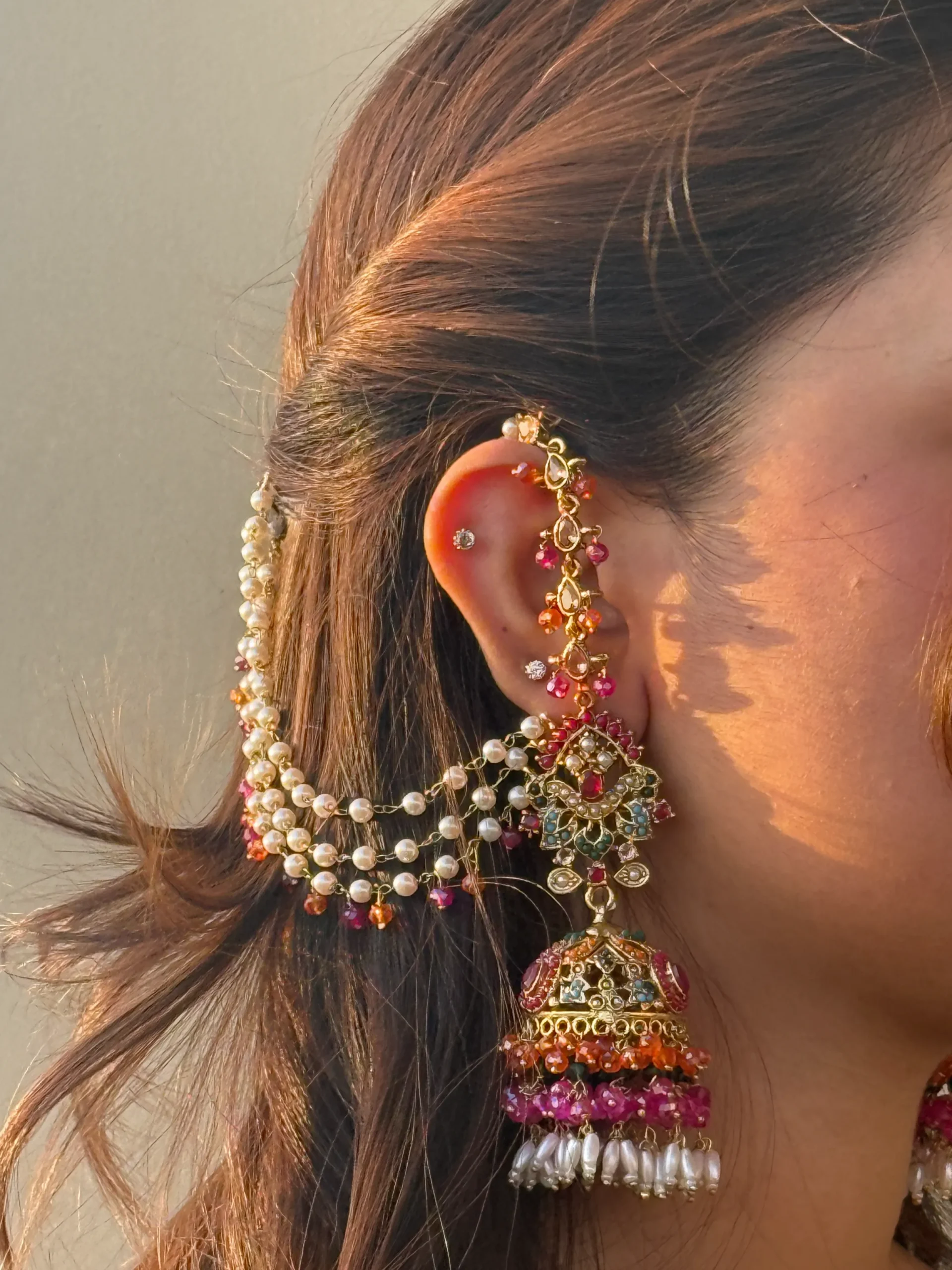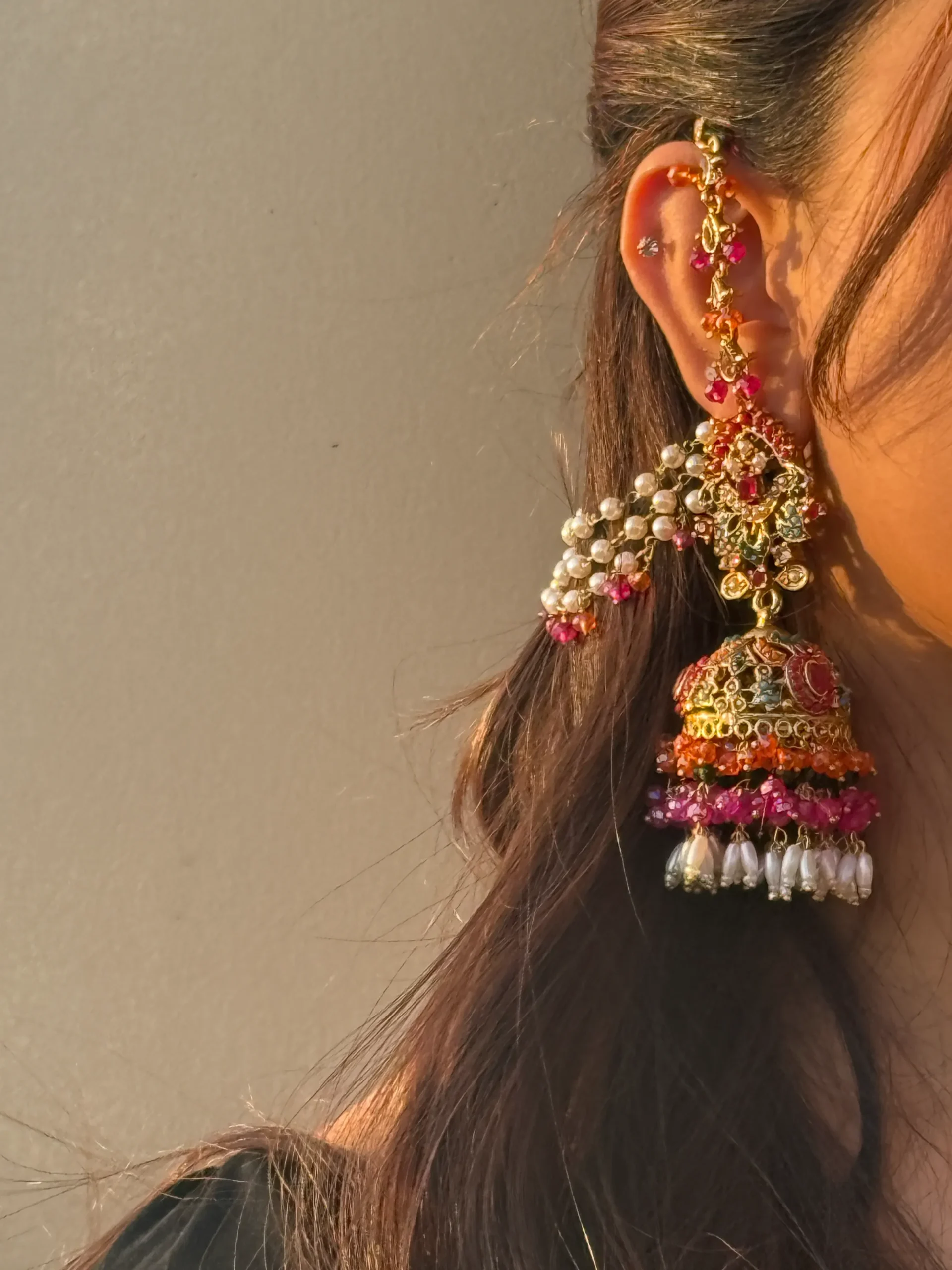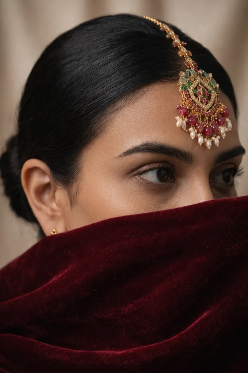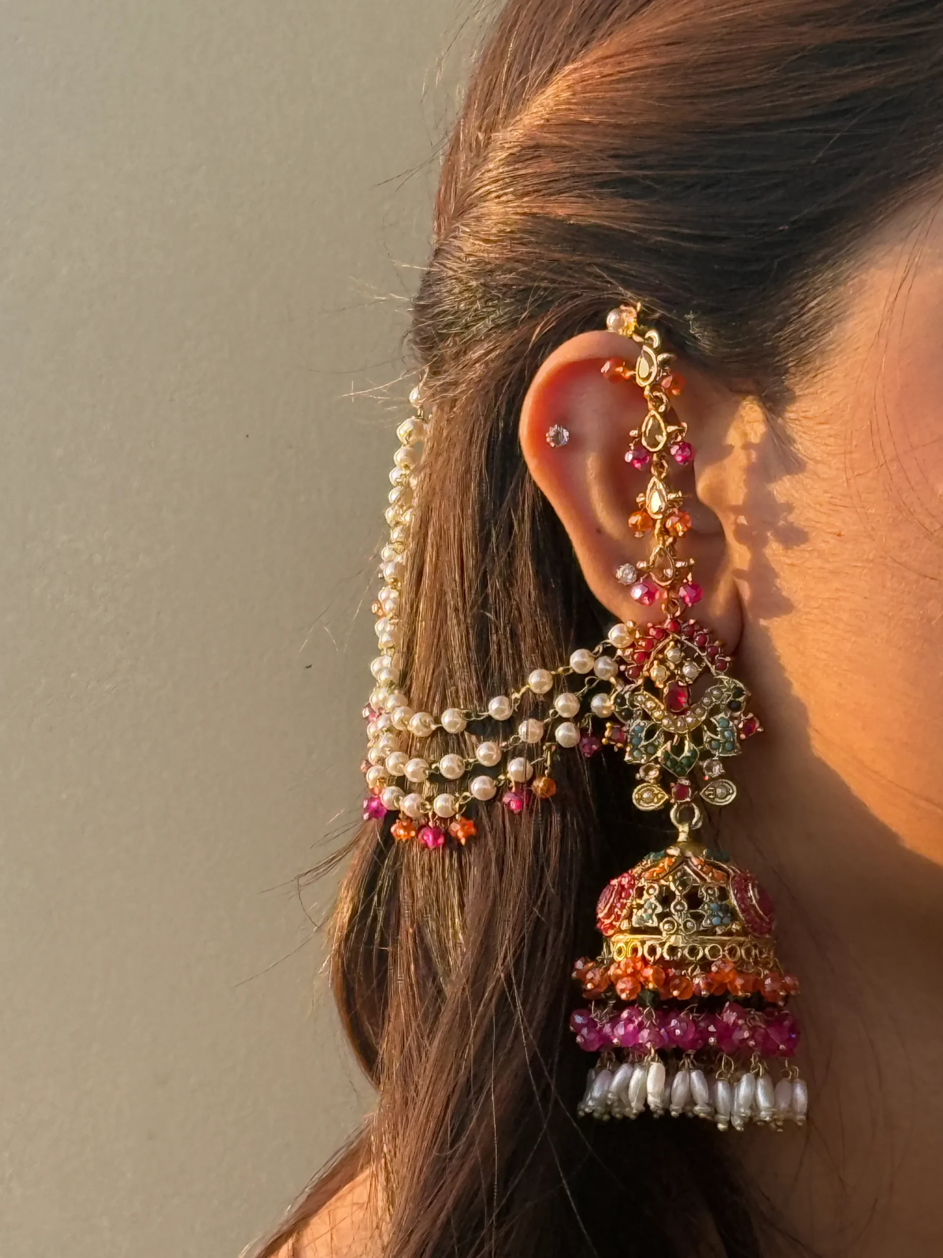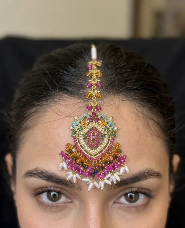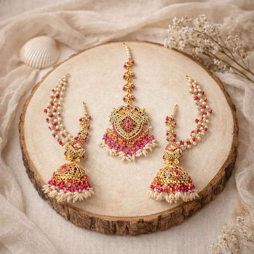 Beautiful gold-tone jhumka earrings adorned with pink ruby stones and delicate pearl drops. This elegant traditional set also includes a matching maang tikka, making it a perfect choice for weddings, parties, and festive occasions. Lightweight and versatile, it pairs beautifully with outfits like sarees, lehengas, or formal dresses.