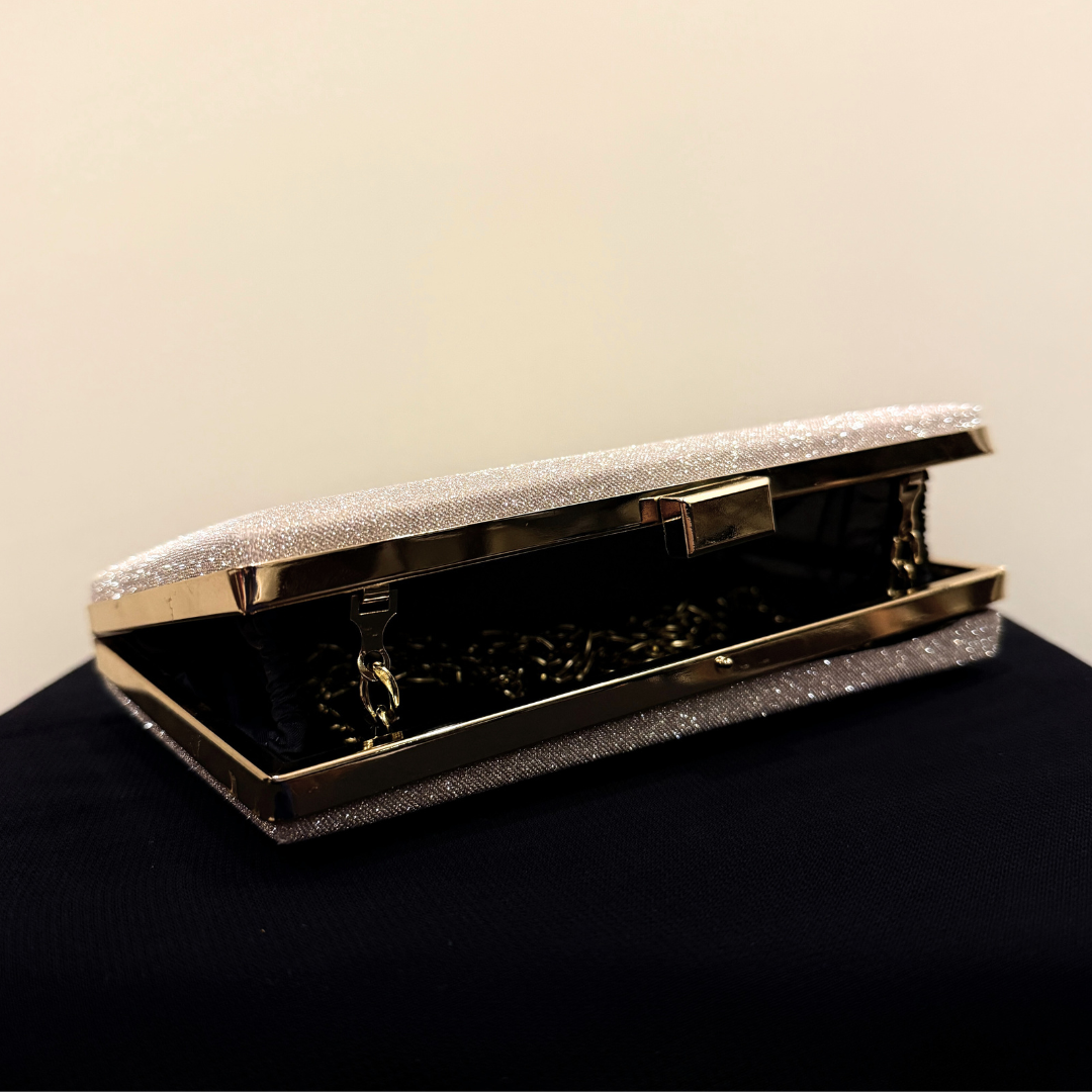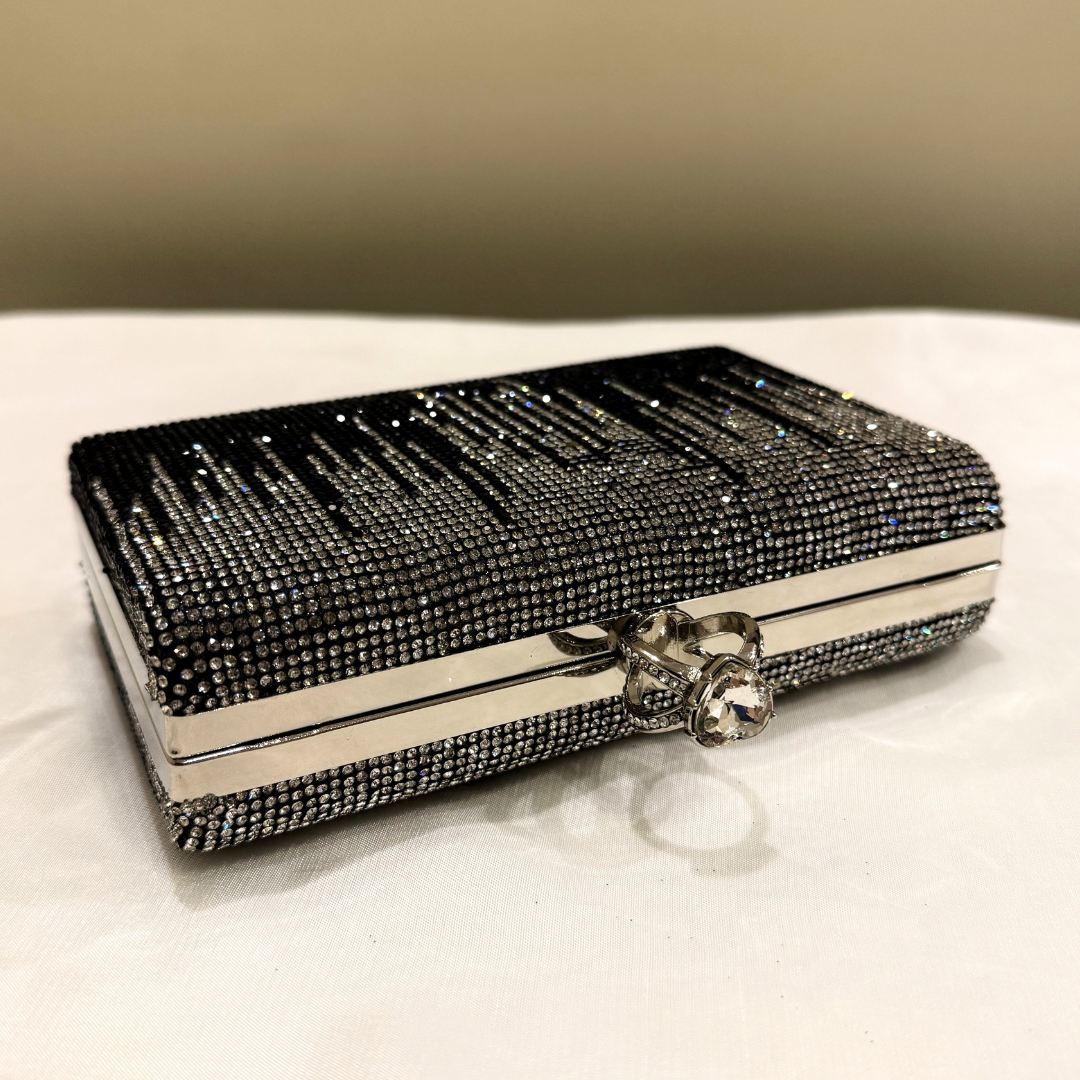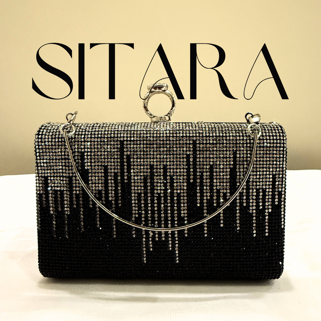 | Make a dazzling entrance with the SITARAΒ (meaning ‘Star’) clutch. This stunning evening bag features a glamorous design where thousands of shimmering rhinestones create a striking black-to-silver cascade effect, reminiscent of falling stars. The lower half is densely black, fading into a silver drizzle pattern towards the top. It is crowned with a unique, ring-style crystal handle that doubles as a statement accessory. A detachable silver chain allows for versatile carrying. |