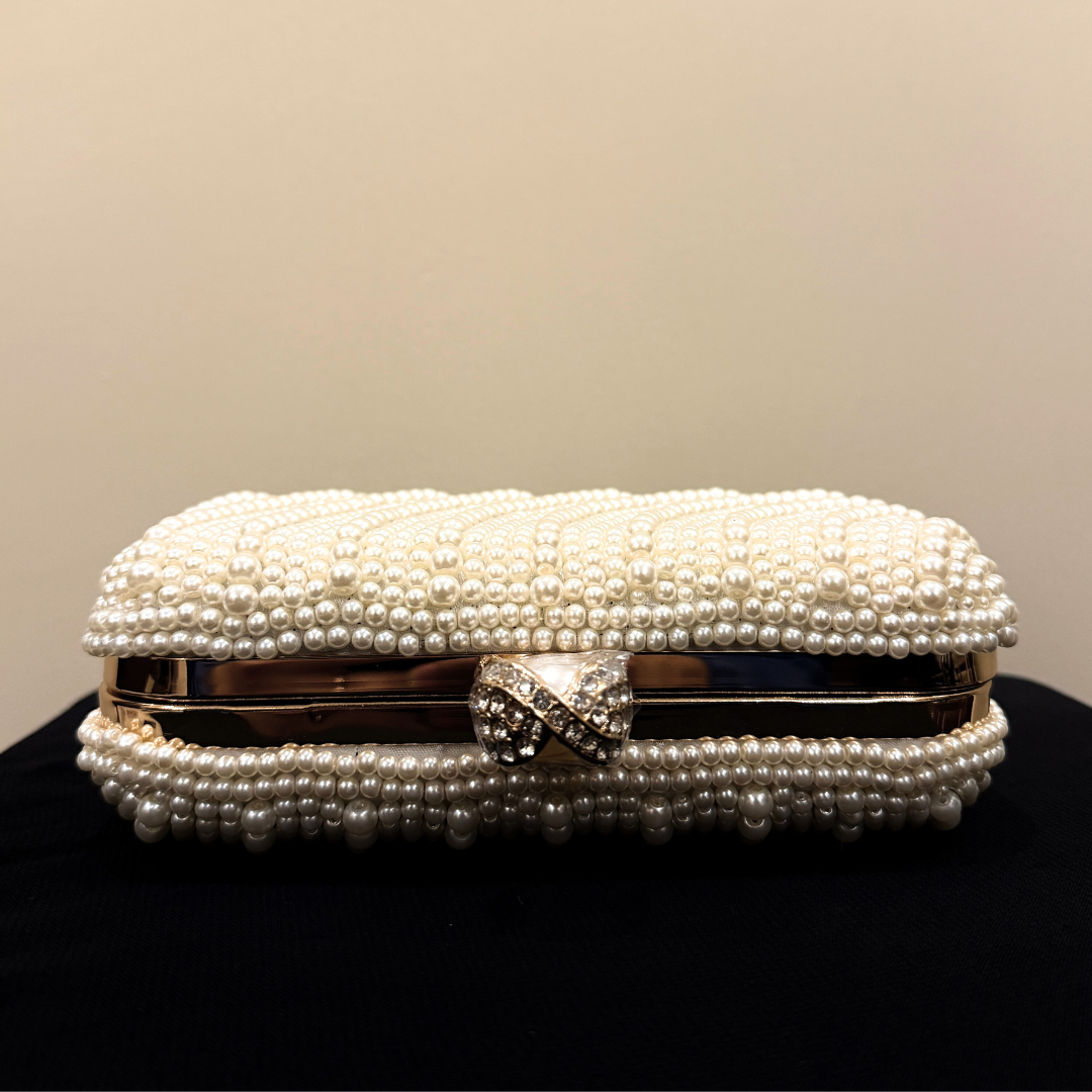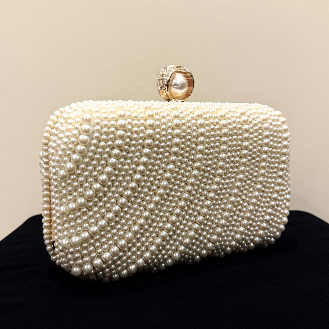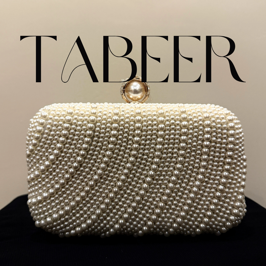 | The TABEERΒ clutch is a vision of pure, unadulterated elegance. Unlike the Mannat clutch, Tabeer offers a more organic, densely-packed coverage of ivory-toned pearls of varied sizes. The focus here is on the beautiful, tactile texture created solely by the pearls, resulting in a classic, domed silhouette. Its closure is a beautiful, subtle gold-toned clasp, featuring a central pearl surrounded by dazzling crystals. |