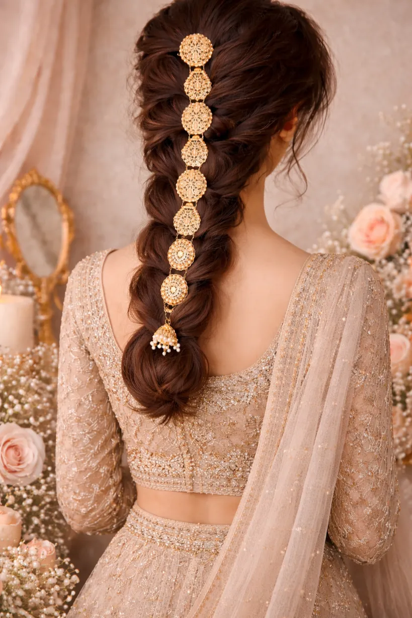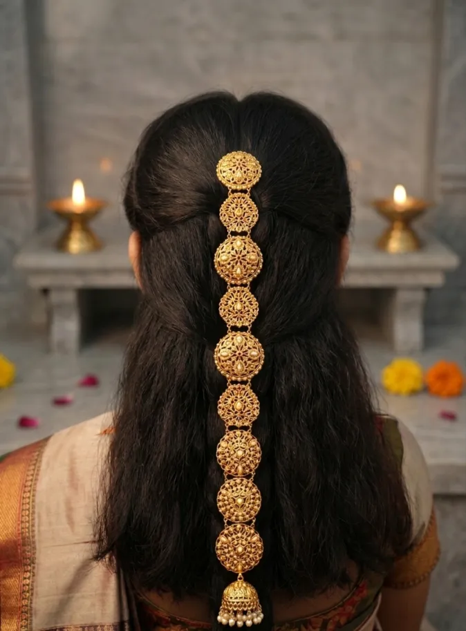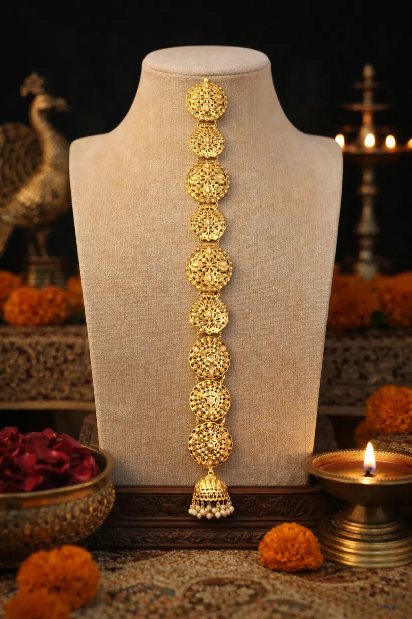 This beautiful gold-plated Paranda is an elegant hair accessory featuring multiple round floral motifs with fine gold work. The piece flows gracefully down the braid and ends with a traditional Jhumka decorated with pretty white pearls. Its bright golden shine and detailed craftsmanship make it perfect for weddings and festivals, giving you a royal and traditional look.