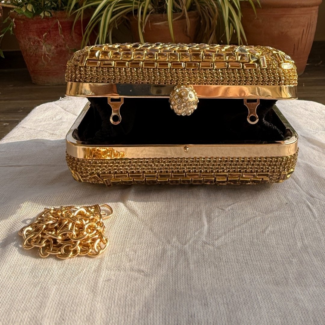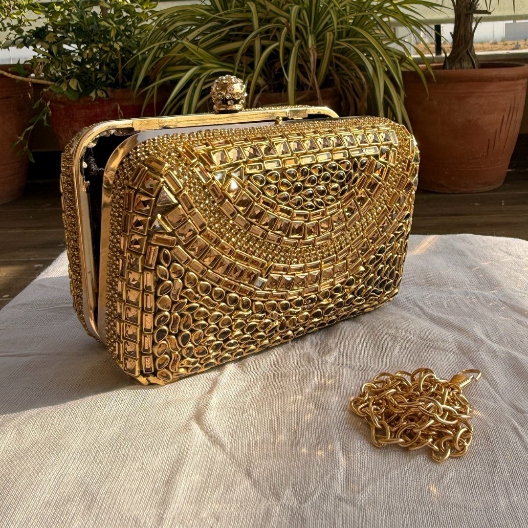 This beautiful antique mini clutch is inspired by our rich heritage. It is carefully decorated by hand with detailed Kundan work that shines beautifully in the light.